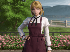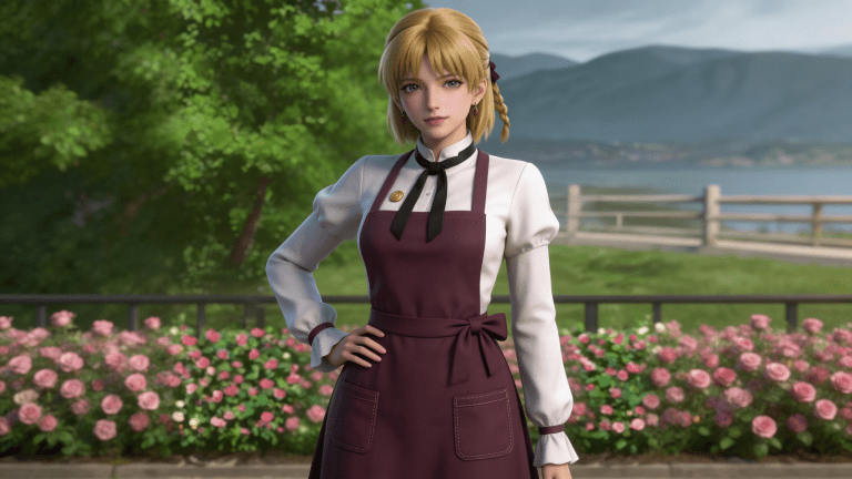 cosplay参考图中的人物,摆出帅气姿势,写实风格,写真风格,东方韵味,神性美感,建模3d皮肤,次表面散射,皮肤光泽感强,水润通透,精细的皮肤纹理,精细的衣服纹理,白嫩皮肤,美白滤镜,真人3d建模脸,超高分辨率,全身女,ue5建模,高细节,电影级特效,高挑修长,3d动画渲染,景深。高饱和,反射,折射,肌理质感。大片高级感,电影美学,大师杰作。CGI,虚幻引擎5渲染,oc渲染。白色长袖衬衫,材质为棉质布料,表面有轻微褶皱感;领口为立领设计,系有黑色领结,领结宽大且对称;胸前左侧有一个金色圆形纽扣装饰;外搭深紫色围裙式连衣裙,围裙为前襟双口袋设计,口袋边缘有自然缝线处理;围裙腰部系有同色系宽腰带,腰带自然垂落,形成蝴蝶结状;裙摆为A字型设计,长度及脚踝,裙身呈自然垂坠感;袖口为翻边设计,翻边处有褶皱处理,增强立体感;整体为经典欧式女仆风格女性礼服,融合复古与田园元素,色彩以白、紫、黑为主,视觉端庄且富有层次感。高细节,清晰线条,光影柔和。
