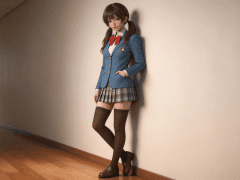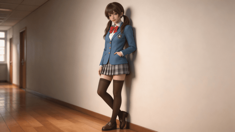 cosplay参考图中的人物,摆出帅气姿势,写实风格,写真风格,东方韵味,神性美感,建模3d皮肤,次表面散射,皮肤光泽感强,水润通透,精细的皮肤纹理,精细的衣服纹理,白嫩皮肤,美白滤镜,真人3d建模脸,超高分辨率,全身女,ue5建模,高细节,电影级特效,高挑修长,3d动画渲染,景深。高饱和,反射,折射,肌理质感。大片高级感,电影美学,大师杰作。CGI,虚幻引擎5渲染,oc渲染。浅蓝色西装外套,材质为挺括棉质布料,表面有轻微光泽感;外套为单排扣设计,纽扣为金色圆形,共三颗,整齐排列;左胸处有一个绿色盾形徽章,徽章上有白色汉字“未”字,边缘有金色线条勾勒;内搭白色衬衫,衬衫领口为立领设计,领口处系有红色蝴蝶结,蝴蝶结宽大且对称;下身穿着灰白格纹百褶裙,裙摆为A字型设计,长度及大腿中部,裙身有多层褶皱,自然垂落;腿部穿着深棕色过膝长袜,袜子材质为弹性尼龙,表面光滑且反光明显;脚穿深棕色皮鞋,鞋型为低跟乐福鞋,鞋面有金属搭扣装饰;整体为日式经典女高中生制服风格,融合校园与青春元素,色彩以蓝、白、红、灰为主,视觉清新且富有层次感。高细节,清晰线条,光影柔和。