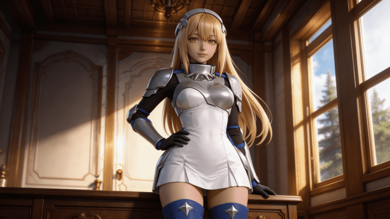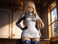 cosplay参考图中的人物,摆出帅气姿势,写实风格,写真风格,东方韵味,神性美感,建模3d皮肤,次表面散射,皮肤光泽感强,水润通透,精细的皮肤纹理,精细的衣服纹理,白嫩皮肤,美白滤镜,真人3d建模脸,超高分辨率,全身女,ue5建模,高细节,电影级特效,高挑修长,3d动画渲染,景深。高饱和,反射,折射,肌理质感。大片高级感,电影美学,大师杰作。CGI,虚幻引擎5渲染,oc渲染。金发少女,金色眼眸,头戴银灰色科技风头箍(带护耳结构),身穿白色紧身连衣裙式战甲(胸前与肩部覆盖光滑金属装甲板,边缘有蓝色装饰条),内搭黑色长袖打底衣,手臂配有分段式银灰护臂(关节处为深蓝布料拼接),腿部穿着高筒蓝色过膝靴(靴面中央饰有银色星形徽章),整体造型融合“女仆装”与“未来骑士铠甲”元素,兼具优雅与战斗感。