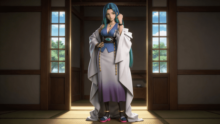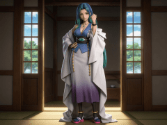 cosplay参考图中的人物,摆出帅气姿势,写实风格,写真风格,东方韵味,神性美感,建模3d皮肤,次表面散射,皮肤光泽感强,水润通透,精细的皮肤纹理,精细的衣服纹理,白嫩皮肤,美白滤镜,真人3d建模脸,超高分辨率,全身女,ue5建模,高细节,电影级特效,高挑修长,3d动画渲染,景深。高饱和,反射,折射,肌理质感。大片高级感,电影美学,大师杰作。CGI,虚幻引擎5渲染,oc渲染。蓝发女性角色,绿色眼眸,身着渐变紫白长裙(上身为深V领蓝色抹胸设计),外披宽大白色和风羽织(袖口与下摆飘逸,带有层叠褶皱),腰间系黑色宽腰带(中央镶嵌椭圆形青绿色宝石,两侧垂挂金色链饰),颈戴简约金项链配绿宝石吊坠,手腕佩戴黑色手环,脚踝处有金色圆环装饰,足穿传统日式木屐(鞋底粉红,鞋面深蓝带条纹)。