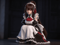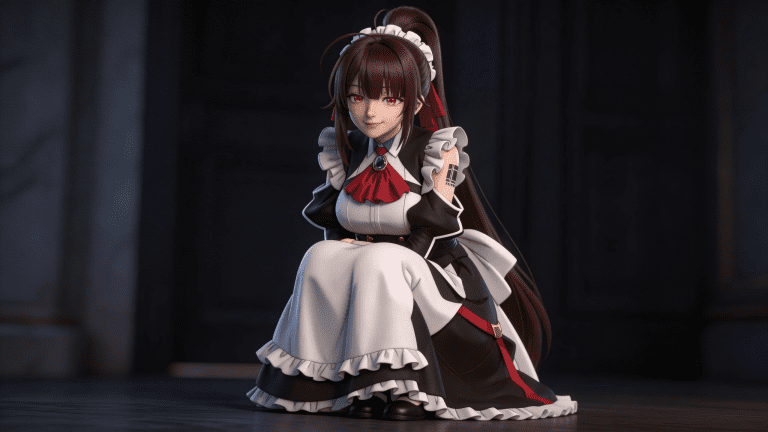 cosplay参考图中的人物,摆出帅气姿势,写实风格,写真风格,东方韵味,神性美感,建模3d皮肤,次表面散射,皮肤光泽感强,水润通透,精细的皮肤纹理,精细的衣服纹理,白嫩皮肤,美白滤镜,真人3d建模脸,超高分辨率,全身女,ue5建模,高细节,电影级特效,高挑修长,3d动画渲染,景深。高饱和,反射,折射,肌理质感。大片高级感,电影美学,大师杰作。CGI,虚幻引擎5渲染,oc渲染。棕发少女(高马尾+刘海),粉红色眼眸,头戴白色荷叶边女仆头饰,身穿经典黑白配色女仆装: 上身:白色立领衬衫 + 黑色短外套(袖口与肩部有蓬松白色荷叶边装饰) 胸前:红色大蝴蝶结领结,中央镶嵌绿色宝石胸针 腰部:黑色细腰带配金色扣环 下身:宽大白色围裙式长裙(多层荷叶边下摆,内衬黑色裙摆) 手臂:左臂外侧可见黑色条形码纹身/标记 脚部:黑色平底鞋(部分被裙摆遮挡) 整体风格为“哥特萝莉风女仆装”,融合优雅、神秘与轻微科幻元素(如手臂条码),表情温柔带笑,姿态端庄坐姿。