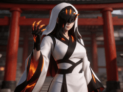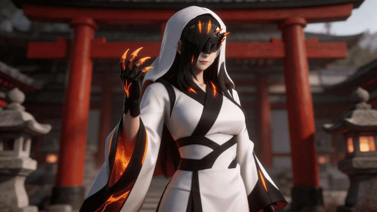cosplay参考图中的人物,摆出帅气姿势,写实风格,写真风格,东方韵味,神性美感,建模3d皮肤,次表面散射,皮肤光泽感强,水润通透,精细的皮肤纹理,精细的衣服纹理,白嫩皮肤,美白滤镜,真人3d建模脸,超高分辨率,全身女,ue5建模,高细节,电影级特效,高挑修长,3d动画渲染,景深。高饱和,反射,折射,肌理质感。大片高级感,电影美学,大师杰作。CGI,虚幻引擎5渲染,oc渲染。神秘黑发女性角色,面部被黑色面具覆盖(面具上有橙色发光裂隙与尖角装饰),头戴宽大白色兜帽斗篷,整体造型融合“巫女袍”与“暗黑法师长袍”元素: 主服饰:纯白宽松和服式长袍(V领设计,袖口宽大飘逸) 装饰细节:衣襟、袖缘及下摆嵌入黑色几何拼接块,内衬透出熔岩般橙红色光效 手部:佩戴黑色紧身手套,指尖延伸出锋利橙色爪状结构(似能量具现化) 腰间:系黑色宽腰带,部分区域亦散发微光 材质表现:布料柔顺垂坠 + 黑色部件哑光质感 + 橙色光芒半透明流动感 整体风格为“日式灵异/神道教祭司 × 黑暗幻想”,充满压迫感与神圣禁忌氛围。