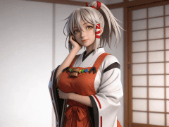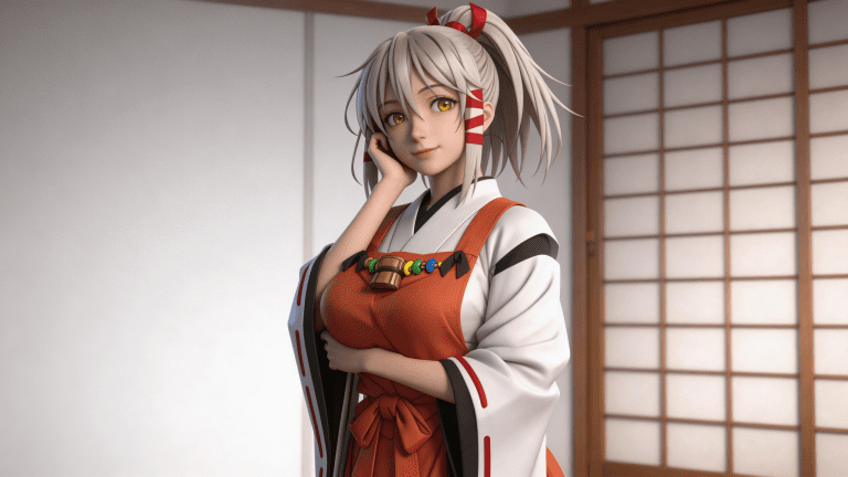 cosplay参考图中的人物,摆出帅气姿势,写实风格,写真风格,东方韵味,神性美感,建模3d皮肤,次表面散射,皮肤光泽感强,水润通透,精细的皮肤纹理,精细的衣服纹理,白嫩皮肤,美白滤镜,真人3d建模脸,超高分辨率,全身女,ue5建模,高细节,电影级特效,高挑修长,3d动画渲染,景深。高饱和,反射,折射,肌理质感。大片高级感,电影美学,大师杰作。CGI,虚幻引擎5渲染,oc渲染。银发少女(高马尾+红色缎带发饰),金黄色眼眸,温柔微笑手托脸颊,身穿融合“巫女服”与“和风围裙装”的可爱造型: 内层:白色宽袖和服(领口及袖缘为黑色镶边,袖口有红黑条纹装饰) 外层:橙红色无袖围裙式上衣(胸前系大蝴蝶结,肩带配有彩色珠串与木制卷轴状挂饰) 腰部:同色系腰带打结于身前,增添层次感 配饰:耳侧垂落红色流苏发带,整体配色温暖活泼