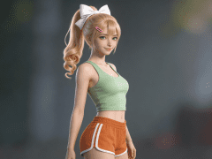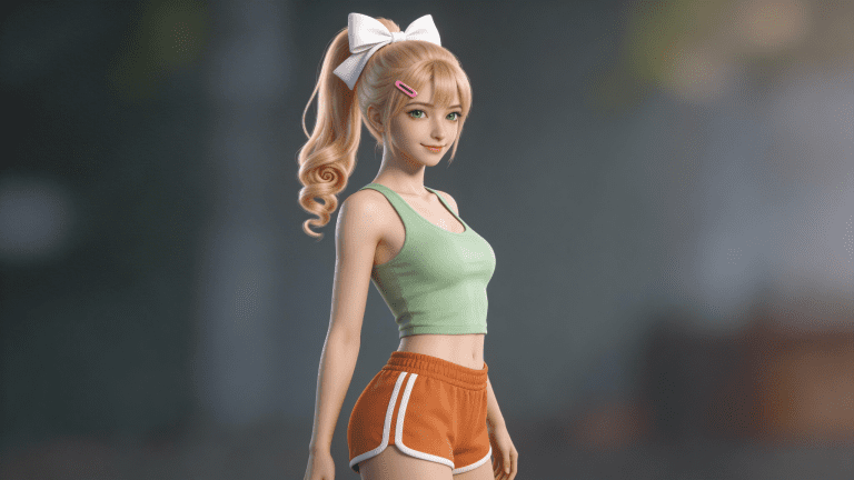 cosplay参考图中的人物,摆出帅气姿势,写实风格,写真风格,东方韵味,神性美感,建模3d皮肤,次表面散射,皮肤光泽感强,水润通透,精细的皮肤纹理,精细的衣服纹理,白嫩皮肤,美白滤镜,真人3d建模脸,超高分辨率,全身女,ue5建模,高细节,电影级特效,高挑修长,3d动画渲染,景深。高饱和,反射,折射,肌理质感。大片高级感,电影美学,大师杰作。CGI,虚幻引擎5渲染,oc渲染。金发少女(高马尾+白色大蝴蝶结发饰,发尾螺旋卷曲),绿色眼眸,俏皮微笑侧身回头,身穿休闲居家运动风 outfit: 上身:浅绿色低领无袖背心(贴身剪裁,凸显身形曲线) 下身:橙棕色运动短裤(腰部松紧带设计,侧边有白色条纹装饰) 配饰:刘海处别着粉色小发夹,增添可爱细节 整体配色:清新活力系(绿 + 橙 + 白),充满青春动感