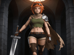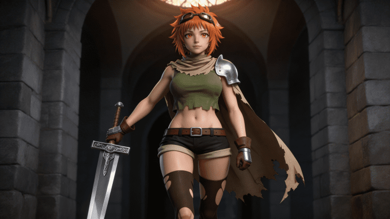 cosplay参考图中的人物,摆出帅气姿势,写实风格,写真风格,东方韵味,神性美感,建模3d皮肤,次表面散射,皮肤光泽感强,水润通透,精细的皮肤纹理,精细的衣服纹理,白嫩皮肤,美白滤镜,真人3d建模脸,超高分辨率,全身女,ue5建模,高细节,电影级特效,高挑修长,3d动画渲染,景深。高饱和,反射,折射,肌理质感。大片高级感,电影美学,大师杰作。CGI,虚幻引擎5渲染,oc渲染。橙发短发少女(头顶戴复古飞行员护目镜),琥珀色眼眸,表情坚毅略带羞涩,身穿“废土冒险者 × 奇幻女战士”混搭风格战斗装束: 上身:橄榄绿色无袖紧身短上衣(下摆不规则撕裂设计,露出腹部肌肉线条) 颈部:围米色粗布围巾(自然垂落肩头) 肩部:左肩佩戴银色金属护肩甲(简约弧形设计) 腰部:系棕色皮质腰带(配银色方形扣环) 下身:黑色高腰短裤(裤脚卷边+内衬米色布料) 腿部:穿着破洞深棕色过膝长袜(多处磨损露肤,凸显战斗痕迹) 足部:棕褐色厚底靴(靴筒翻折,搭配同色系绑带) 手部:戴棕色皮质手套 + 左手腕配银色金属护腕 武器:右手持一把大型双手剑(剑柄缠绕皮革,护手雕花精致,剑身修长锋利) 背部:披一件破损米色斗篷(边缘烧焦/撕裂,随风飘动)