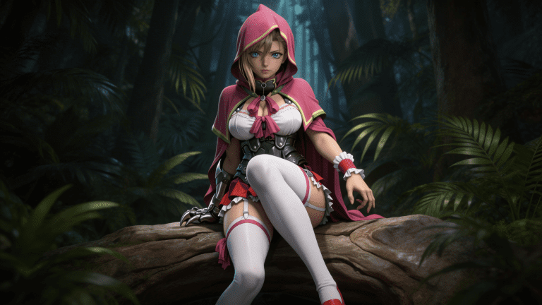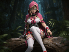 cosplay参考图中的人物,摆出帅气姿势,写实风格,写真风格,东方韵味,神性美感,建模3d皮肤,次表面散射,皮肤光泽感强,水润通透,精细的皮肤纹理,精细的衣服纹理,白嫩皮肤,美白滤镜,真人3d建模脸,超高分辨率,全身女,ue5建模,高细节,电影级特效,高挑修长,3d动画渲染,景深。高饱和,反射,折射,肌理质感。大片高级感,电影美学,大师杰作。CGI,虚幻引擎5渲染,oc渲染。金发蓝眼少女(部分刘海垂落),身穿“魔法少女 × 战斗女仆 × 奇幻冒险者”融合风格装束,坐于森林岩石之上,神情冷峻: 头部:佩戴亮粉色连帽斗篷(帽沿与袖口饰有黄绿色滚边,内衬深紫红色) 上身: 内搭白色抹胸式紧身衣(胸前系大蝴蝶结,边缘带蕾丝花边) 外覆黑色金属质感护甲背心(分段式设计,覆盖肋骨与腹部,带有铆钉与扣环细节) 腰部:红色短裙层叠于护甲之下(裙摆缀白色荷叶边) 腿部: 穿着纯白过膝长袜(大腿处配有粉色吊袜带+蝴蝶结装饰) 右腿外侧可见银色机械爪状护具(似义肢或战斗装备) 手臂: 左手腕戴红白相间荷叶边袖套(类似女仆手套延伸设计) 右手自然垂放,指尖轻触地面 足部:隐约可见红色高跟鞋尖端 整体配色以粉、白、黑为主,点缀红与金属灰,风格甜美又危险,兼具“萌系”与“战力感”。