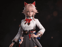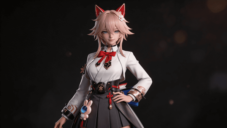 cosplay参考图中的人物,摆出帅气姿势,写实风格,写真风格,东方韵味,神性美感,建模3d皮肤,次表面散射,皮肤光泽感强,水润通透,精细的皮肤纹理,精细的衣服纹理,白嫩皮肤,美白滤镜,真人3d建模脸,超高分辨率,全身女,ue5建模,高细节,电影级特效,高挑修长,3d动画渲染,景深。高饱和,反射,折射,肌理质感。大片高级感,电影美学,大师杰作。CGI,虚幻引擎5渲染,oc渲染。粉发紫瞳少女(短发蓬松+头顶佩戴红色猫耳装饰),面带温柔微笑,身穿“和风学院制服 × 奇幻战斗装束”融合风格: 上身: 白色立领长袖衬衫(前襟交叉设计,袖口饰有金色云纹刺绣) 领口系大红色蝴蝶结(下方垂挂黑底金边菱形徽章) 颈部佩戴黑色项圈(带金属扣环) 腰部: 宽版黑色皮质腰带(中央镶嵌圆形家纹徽章——樱花图案) 腰带两侧缀红色流苏与小铃铛,增添灵动细节 下身: 深灰色高腰百褶裙(侧边可见蓝色内衬) 左腰悬挂粉色兔子造型挂件(嵌蓝宝石眼睛,可爱又神秘) 手臂: 右臂外侧别一枚干枯枫叶胸针 左手腕处有金色护腕式装饰(带机械感结构) 发饰: 右侧鬓角插一朵白色樱花发簪 头顶猫耳为红白配色,边缘镶金线