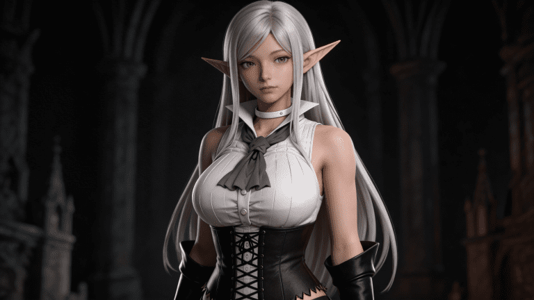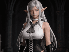 cosplay参考图中的人物,摆出帅气姿势,写实风格,写真风格,东方韵味,神性美感,建模3d皮肤,次表面散射,皮肤光泽感强,水润通透,精细的皮肤纹理,精细的衣服纹理,白嫩皮肤,美白滤镜,真人3d建模脸,超高分辨率,全身女,ue5建模,高细节,电影级特效,高挑修长,3d动画渲染,景深。高饱和,反射,折射,肌理质感。大片高级感,电影美学,大师杰作。CGI,虚幻引擎5渲染,oc渲染。银发精灵少女(长直发+尖耳),表情沉静,身穿“哥特奇幻风女战士/贵族礼服”混合装束: 上身: 白色高领紧身胸衣(前襟有竖向褶皱与纽扣装饰) 领口系深灰色蝴蝶结领巾(自然垂落,增添优雅感) 颈部佩戴简约项圈(光滑圆环状,无多余装饰) 腰部: 黑色束腰马甲(正面采用交叉绑带设计,强化腰线轮廓) 马甲边缘呈锯齿状剪裁,带有野性或战斗气息 手臂: 穿着黑色长袖手套(覆盖至肘部,袖口宽大外翻)