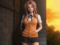 cosplay参考图中的人物,摆出帅气姿势,写实风格,写真风格,东方韵味,神性美感,建模3d皮肤,次表面散射,皮肤光泽感强,水润通透,精细的皮肤纹理,精细的衣服纹理,白嫩皮肤,美白滤镜,真人3d建模脸,超高分辨率,全身女,ue5建模,高细节,电影级特效,高挑修长,3d动画渲染,景深。高饱和,反射,折射,肌理质感。大片高级感,电影美学,大师杰作。CGI,虚幻引擎5渲染,oc渲染。粉棕长发少女(自然垂落+微卷发梢),蓝色眼眸温柔含笑,身穿“日式校园制服 + 针织开衫”日常搭配: 上身: 内搭白色短袖衬衫(领口系黑色蝴蝶结领带,前襟有纽扣) 外穿橙黄色V领针织开衫(正面四颗圆形纽扣,下摆与袖口为罗纹收边,两侧各有一个贴袋) 下身:深灰色百褶短裙(长度及大腿中部,经典校服款式) 配饰:左肩背黑色单肩书包(简约设计,带拉链与侧袋) 整体配色:暖橙 + 白 + 黑灰,青春活力又不失知性