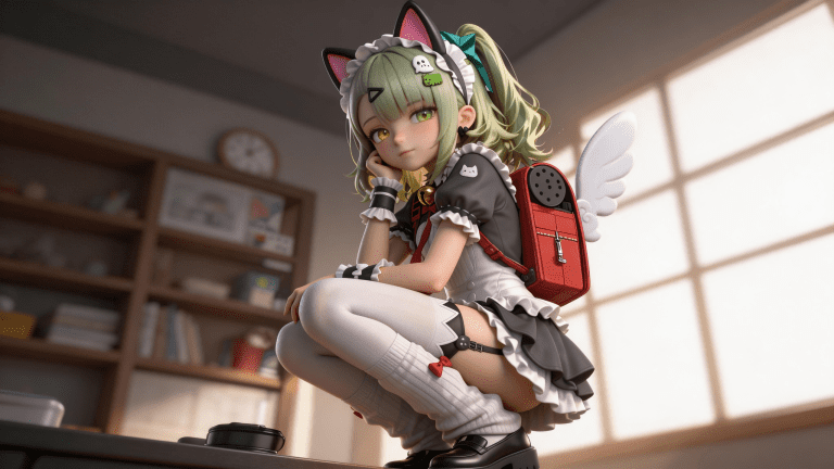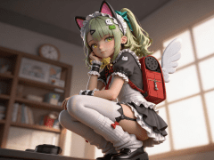 cosplay参考图中的人物,摆出帅气姿势,写实风格,写真风格,东方韵味,神性美感,建模3d皮肤,次表面散射,皮肤光泽感强,水润通透,精细的皮肤纹理,精细的衣服纹理,白嫩皮肤,美白滤镜,真人3d建模脸,超高分辨率,全身女,ue5建模,高细节,电影级特效,高挑修长,3d动画渲染,景深。高饱和,反射,折射,肌理质感。大片高级感,电影美学,大师杰作。CGI,虚幻引擎5渲染,oc渲染。浅绿渐变金发少女(高马尾+猫耳头饰),异色瞳(左黄右绿),脸颊微红托腮蹲坐,身穿“萌系女仆装 × 学生制服 × 可爱配饰”融合造型: 头部: 佩戴黑白相间猫耳发箍(内侧粉红,外侧黑边) 额前别着三角形黑色发夹 + 绿色小恐龙/幽灵贴纸装饰 后脑勺系青绿色蝴蝶结丝带 上身: 内搭白色荷叶边短袖衬衫(领口与袖口多层褶皱) 外穿深灰色无袖背心裙(胸前有红色细带交叉设计,肩部绣小白猫图案) 颈间挂金色铃铛项圈(增添俏皮感) 手臂: 戴黑白条纹腕套(边缘饰荷叶边) 下身: 白色过膝长袜(大腿处配黑色吊袜带 + 红色小蝴蝶结) 脚穿黑色厚底乐福鞋(部分可见) 背部: 背着亮红色方形书包(侧面有圆形通风孔设计,类似复古收音机或机器人背包)