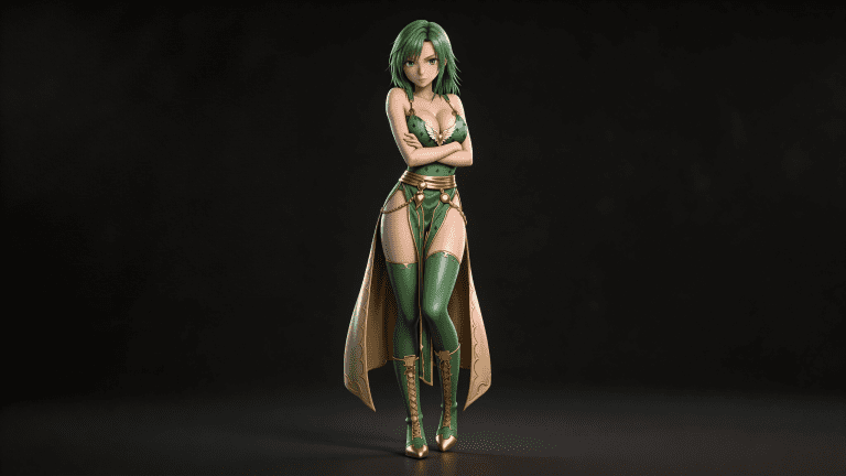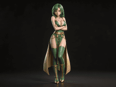 cosplay参考图中的人物,摆出帅气姿势,写实风格,写真风格,东方韵味,神性美感,建模3d皮肤,次表面散射,皮肤光泽感强,水润通透,精细的皮肤纹理,精细的衣服纹理,白嫩皮肤,美白滤镜,真人3d建模脸,超高分辨率,全身女,ue5建模,高细节,电影级特效,高挑修长,3d动画渲染,景深。高饱和,反射,折射,肌理质感。大片高级感,电影美学,大师杰作。CGI,虚幻引擎5渲染,oc渲染。绿发女性角色(齐肩短发+自然垂落刘海),绿色眼眸神情冷峻,双臂交叉站立,身穿“奇幻舞娘 × 战斗祭司”融合风格装束: 上身: 绿色菱形花纹胸衣(细肩带配金色环扣,中央饰有羽翼状金属装饰) 胸部丰满凸显,设计大胆而富有异域风情 腰部: 系宽大金色腰带(中央悬挂心形吊坠与链条流苏) 腰带两侧延伸出高开衩长裙片(前开至大腿根部,边缘镶金线) 下身: 穿着同色系高筒紧身裤袜(覆盖至大腿中部,材质光滑如乳胶) 腿部外侧配有金色绑带护腿(从脚踝延伸至膝盖,采用交叉系带设计) 脚尖为金色包头鞋头(造型复古华丽) 背部: 披一件米黄色长披风(边缘饰卷草纹样,随风飘逸,增添神秘感) 整体配色:翠绿 + 金黄 + 肤色,视觉冲击力强,兼具性感、威严与魔幻气质。