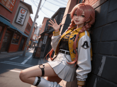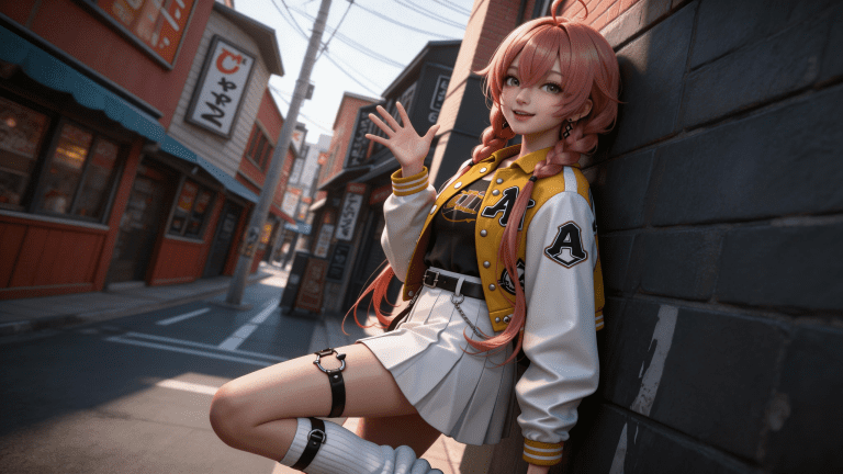 cosplay参考图中的人物,摆出帅气姿势,写实风格,写真风格,东方韵味,神性美感,建模3d皮肤,次表面散射,皮肤光泽感强,水润通透,精细的皮肤纹理,精细的衣服纹理,白嫩皮肤,美白滤镜,真人3d建模脸,超高分辨率,全身女,ue5建模,高细节,电影级特效,高挑修长,3d动画渲染,景深。高饱和,反射,折射,肌理质感。大片高级感,电影美学,大师杰作。CGI,虚幻引擎5渲染,oc渲染。粉发双麻花辫少女(发尾微卷+头顶小呆毛),绿色眼眸明亮活泼,靠墙挥手微笑,身穿“美式街头学院风 × 日系潮流”融合造型: 上身: 内搭黑色印花T恤(胸前有金色吉他图案与字母装饰) 外穿黄白拼接棒球夹克(左胸与右臂饰有大号“A”字徽章,袖口与下摆为黄白条纹罗纹收边) 夹克前襟为金属按扣设计,敞开穿着展现层次 腰部: 系黑色皮质腰带(配银色圆环与链条挂饰,增添朋克感) 下身: 穿着浅灰白色高腰百褶短裙(长度在大腿中部,青春活力) 腿部与足部: 左腿佩戴黑色猫耳造型吊袜带(固定于大腿外侧) 右腿套白色堆堆袜(袜口宽松褶皱,搭配同色系厚底马丁靴) 靴子为系带设计,鞋底厚实,具街头潮流感 整体配色:粉 + 黄 + 白 + 黑,阳光动感,充满“放学后的都市少女”气息。