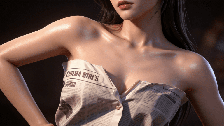 cosplay参考图中的人物,摆出帅气姿势,写实风格,写真风格,东方韵味,神性美感,建模3d皮肤,次表面散射,皮肤光泽感强,水润通透,精细的皮肤纹理,精细的衣服纹理,白嫩皮肤,美白滤镜,真人3d建模脸,超高分辨率,全身女,ue5建模,高细节,电影级特效,高挑修长,3d动画渲染,景深。高饱和,反射,折射,肌理质感。大片高级感,电影美学,大师杰作。CGI,虚幻引擎5渲染,oc渲染。女性上半身特写(仅露出锁骨至唇部),黑发柔顺垂落肩头,皮肤在暖光下呈现细腻光泽,身穿“报纸创意抹胸装”—— 服装设计: 由真实报纸折叠拼接而成的无肩带抹胸上衣 前襟以单颗米色纽扣固定,形成V字领口 报纸版面清晰可见:英文标题如 “CINEMA DINE”、“GUMBO DEXIN’S”,搭配专栏文字与黑白照片(含人物肖像) 纸张边缘自然卷曲、褶皱,模拟手工包裹质感,兼具临时性与艺术感 整体风格: “概念时尚 × 复古拼贴艺术”,融合日常媒介与身体美学 充满实验性、视觉冲击力与隐喻意味