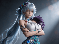 cosplay参考图中的人物,摆出帅气姿势,写实风格,写真风格,神性美感,建模3d皮肤,次表面散射,皮肤光泽感强,水润通透,精细的皮肤纹理,精细的衣服纹理,白嫩皮肤,美白滤镜,真人3d建模脸,超高分辨率,全身女,ue5建模,高细节,电影级特效,高挑修长,3d动画渲染,大片高级感,电影美学,大师杰作。CGI,虚幻引擎5渲染,oc渲染。皮肤白皙干净光滑水润细腻清透。干净光滑的画面风格,呈现出极致清晰的光滑镜面质感画风。CG特效,惊艳,丁达尔光效。电视剧滤镜,五官立体。场景构图。强烈的明暗对比,垂坠感,丰富细节,朦胧感,强化面部阴影,柔焦处理的高斯模糊效果,明暗交错的戏剧性光影,虚实结合的构图张力,双色温闪光灯布光,背景光斑虚化处理。