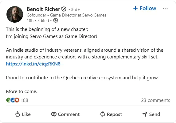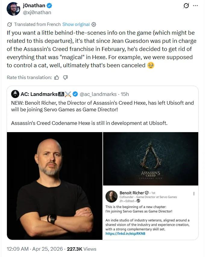 《刺客信条:女巫》项目组再传人事地震。曾担任《蝙蝠侠:阿卡姆起源》总监及《刺客信条:英灵殿》联合总监的资深开发者 Benoit Richer 正式离职,转投新兴独立工作室 Servo Games。短短数月内,该项目已折损第二位首席开发人员。